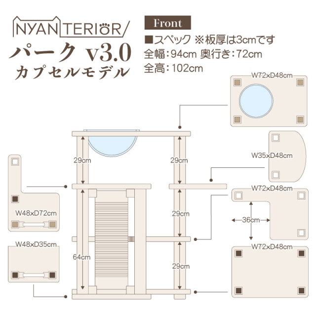 ・全高102cm、土台幅72cm(最大空間幅94cm)、奥行き72cm。お部屋の隅にぴったり嵌る3段構造のミドルタワーです。
