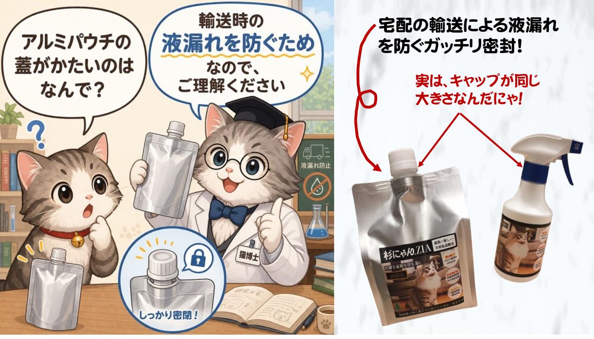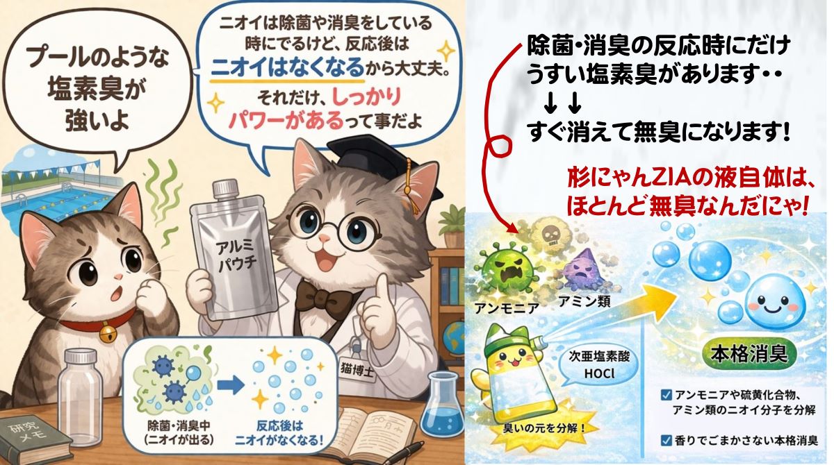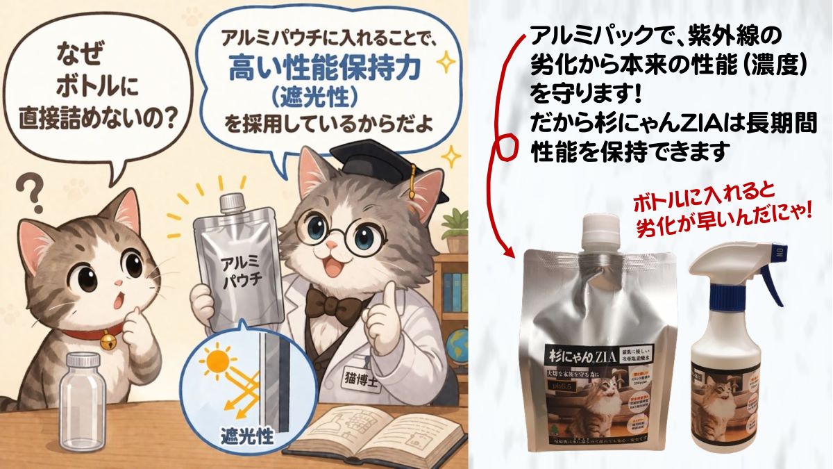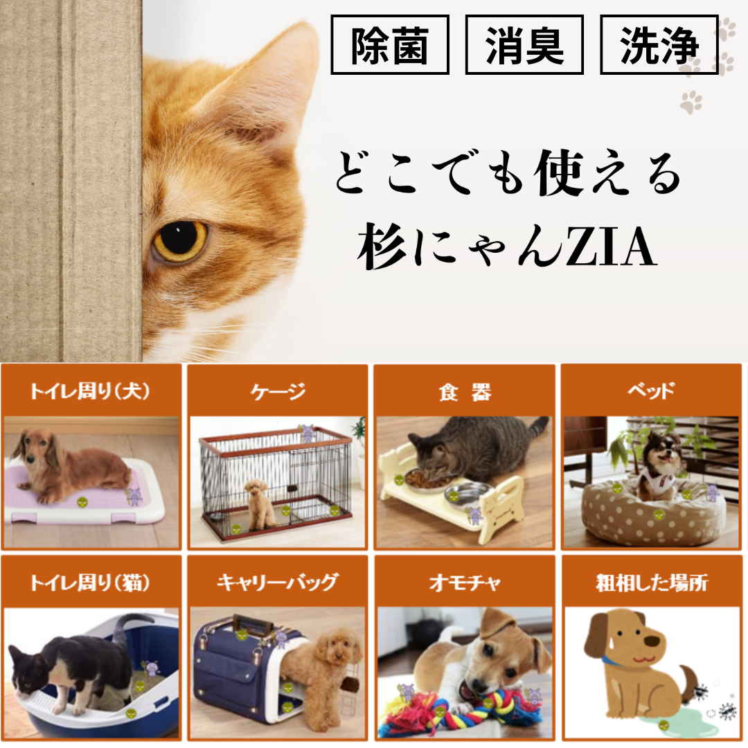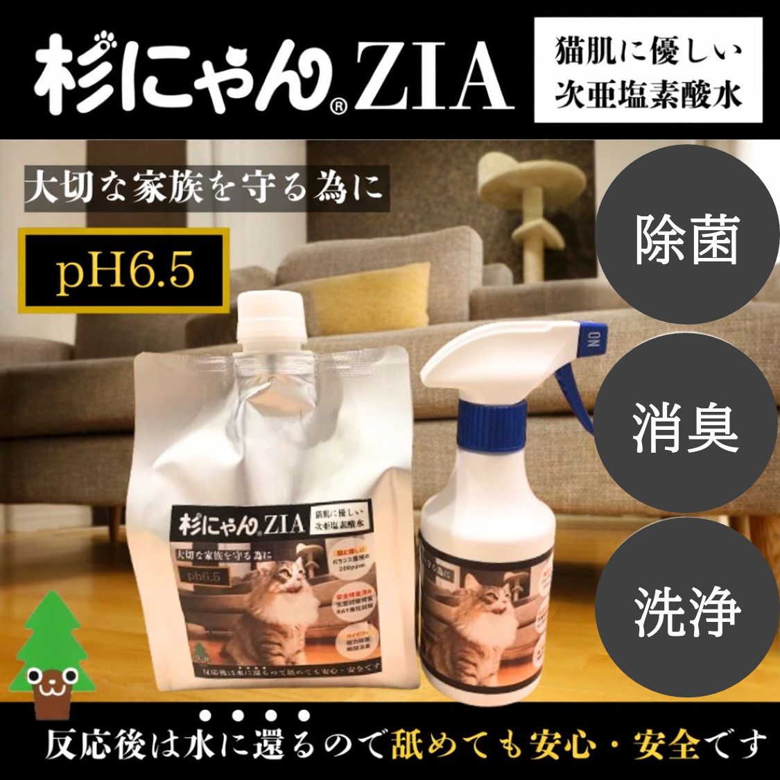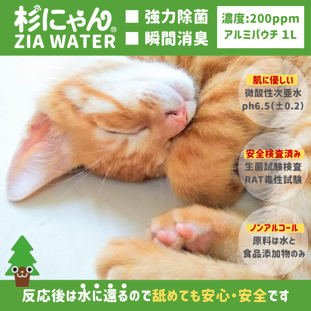 杉にゃんZIAは、安全で猫肌・犬肌に優しい、ペット用の除菌消臭スプレーです。濃度200ppmの新鮮な「次亜塩素酸水」です(※次亜塩素酸ナトリウム/強アルカリ、強刺激/ではありません)。 詰替え用の1Lアルミパックと300mlのスプレーボトルのセットです。強力消臭+強力除菌+強力洗浄なのに安全 安心。 噴霧器でお部屋の空間に噴霧する場合は、4倍に希釈した濃度が適切なのでとても経済的。濃度200ppmは、ペット用に直接使用する場合の最適なバランス(消臭力、性能保持力、安全性、コスパ)です。トイレの臭いも一発消臭。人を含む動物の体内で生成される次亜塩素酸水は安全で安心。除菌・消臭だけでなく、花粉やウィルス、アレルゲンにも効果的だから、次亜塩素酸水はやっぱり凄い。黄色い頑固なおしっこシミも、つけ置き洗いすると「あれっ?消えた」。ぜひお試しください。